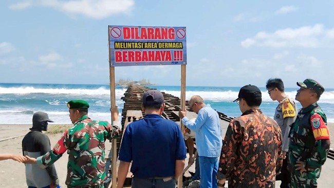 Papan larangan melintas kini terpampang di area masuk jembatan besi dermaga bekas tambang pasir besi di Desa Buniasih, Tegalbuleud, Kabupaten Sukabumi. Warga setempat menyebut papan tersebut dipasang akhir pekan lalu oleh petugas gabungan untuk mencegah terulangnya insiden yang menewaskan tiga nelayan dan menjebak 71 orang hingga harus dievakuasi menggunakan helikopter Basarnas Jakarta.