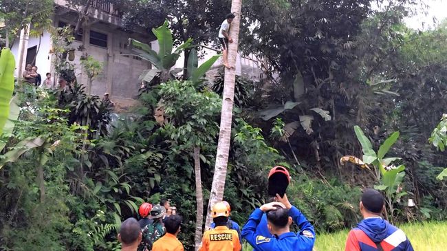 Warga Kampung Bojongpari, Desa Jayabakti, Kecamatan Cidahu, Kabupaten Sukabumi, dikejutkan oleh ulah seorang pria yang memanjat dan bertahan di atas pohon kelapa sejak Kamis (24/10/2024) pagi.