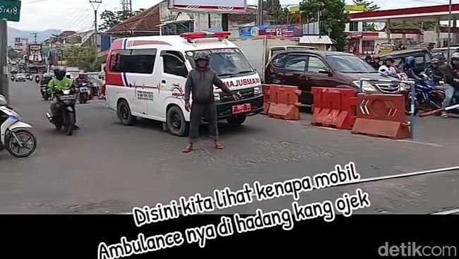 Dalam video berdurasi 40 detik terlihat seorang pria yang disebut sebagai tukang ojek mengenakan helm hitam nampak berdiri di depan ambulans. Bukan tanpa alasan, aksi pria tersebut dilakukan lantaran palang perlintasan sudah ditutup dan jarak kereta api sudah dekat.