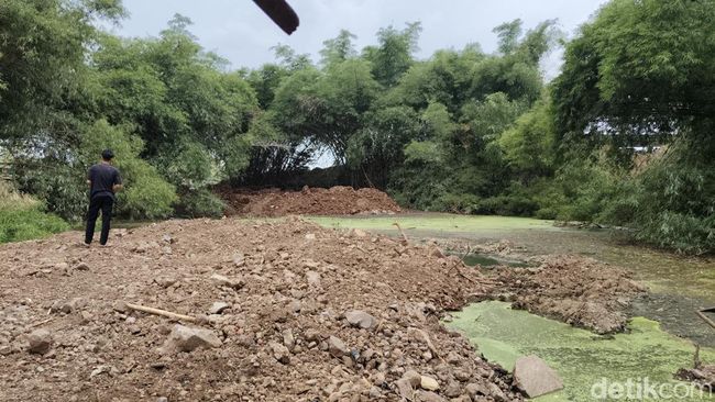 Namun baru setengah bagian kolam yang diurug, sementara sebagian lagi masih berupa kubangan lumpur dan air dengan permukaan yang tertutup tanaman air.