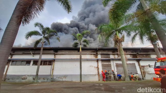 Pantauan detikJabar di lokasi, nampak terdapat enam mobil pemadam kebakaran yang telah datang dan memadamkan kobaran api. Terlihat di atas pabrik kepulan asap terus muncul.