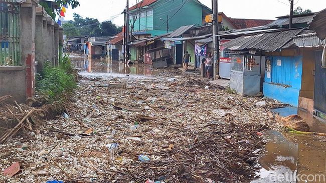 Pantauan detikJabar di lokasi pada Jumat (22/11/2024), nampak sampah dengan material plastik, styrofoam, dan kayu menumpuk di atas genangan banjir. Beberapa warga tidak bisa melintas ke jalan tersebut.