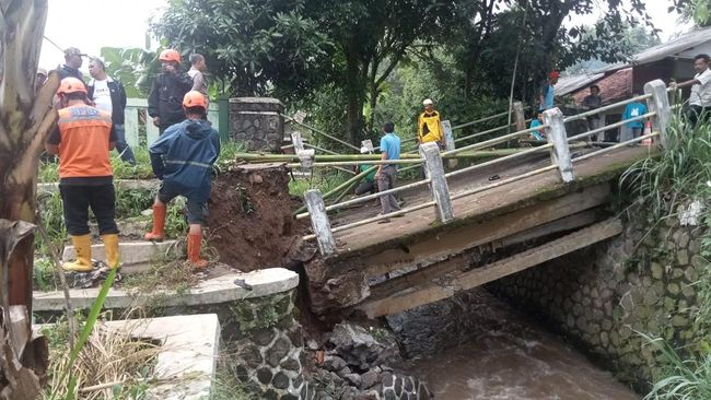 "Berdasarkan informasi yang dihimpun, insiden dimulai dengan derasnya aliran air dari wilayah utara yang mengalir melalui Sungai Cibeureum. Kondisi ini menyebabkan pondasi jembatan tergerus secara perlahan hingga akhirnya roboh pada Sabtu sore," kata Erwan saat dikonfirmasi.