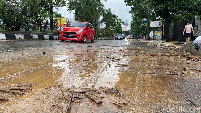 Pantauan detikJabar, Rabu (26/11/2024) sekitar Pukul 15.20 WIB material bambu, kayu, dan sampah rumah tangga menumpuk di pembatas sungai. Sebelumnya, aliran sungai itu naik dan air meluber ke jalan raya.