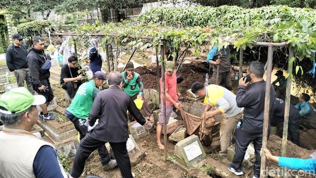 Pantauan detikJabar, Kamis (28/11/2024) pukul 10.30 WIB, puluhan orang sedang menggali makam yang ambles dan memindahkan jenazah yang sudah jadi tulang belulang. Tulang belulang itu kemudian dimasukkan ke dalam kantong jenazah.
