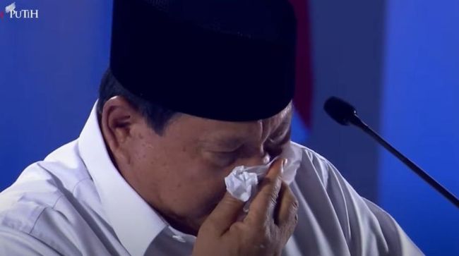 Prabowo tiba-tiba berhenti berbicara dan menangis. Prabowo lalu mengambil tisu dan mengusap air matanya. Para guru yang hadir bergemuruh ketika melihat Prabowo menangis.