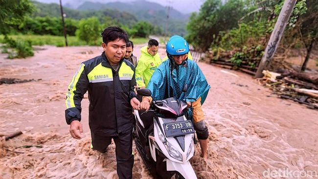 "Kita saat ini berada di desa Loji, ke arah Geopark Cieltuh. Sungai yang debit airnya sudah terlalu berlebihan tidak tertampung dan arus dari ketinggian membawa berbagai material batang pohon yang menutup gorong-gorong atau saluran air. Air kemudian meluap membawa bebatuan dan tanah ke jalan," jelas Samian kepada detikJabar.