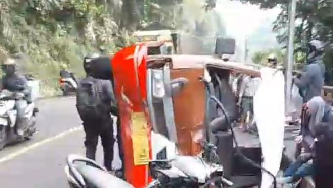 Sebuah angkot terguling di jalur Cadas Pangeran, Kabupaten Sumedang, Jawa Barat, pada Kamis (5/12/2024). Sebanyak enam orang mengalami luka-luka akibat kecelakaan ini.