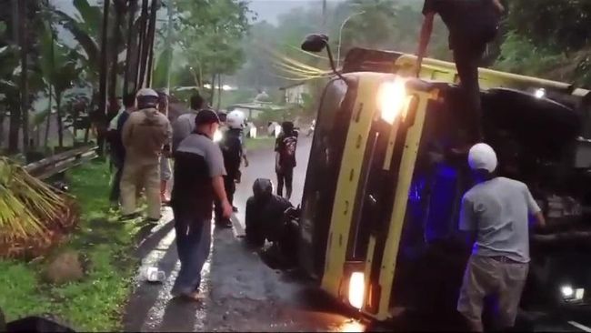 "Awalnya ada kendaraan yang rem mendadak di atas tanjakan. Truk gagal menanjak, mau over gigi kecil gagal hingga mundur. Hantam mini bus dan timpa motor akhirnya setelah terguling," ucap Iwan.