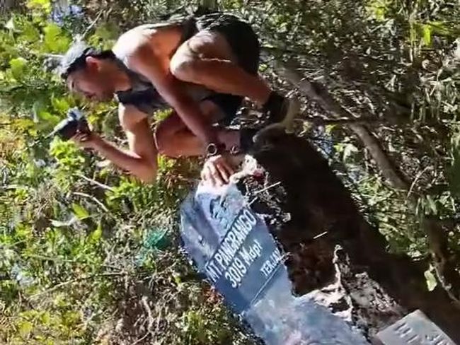 Berdasarkan video yang beredar di media sosial, pendaki laki-laki berjongkok di atas tugu bertuliskan MT Pangrango 3.019 Mdpl.