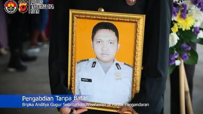 Kepergian Bripka Anditya Munartono (35), anggota Polsek Pagerageung Tasikmalaya, meninggalkan luka mendalam bagi keluarga besar Polres Tasikmalaya Kota dan masyarakat di sekitarnya. Bripka Anditya gugur saat berusaha menyelamatkan nyawa seorang pengunjung yang nyaris tenggelam di Pantai Barat Pangandaran, Jumat (3/1/2025) sore.