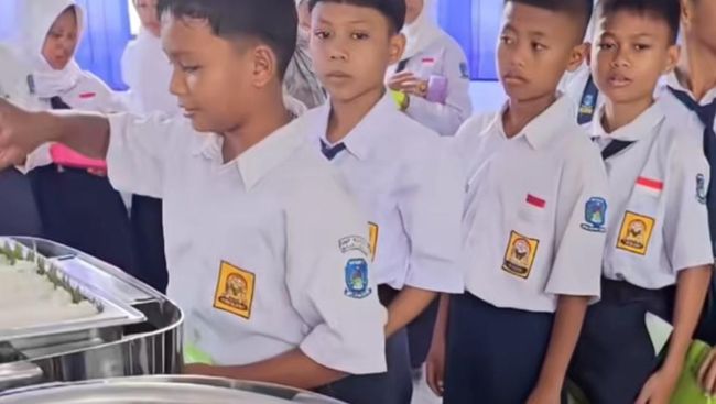 Dalam video tersebut, terlihat sejumlah siswa berbaju putih biru itu tengah antre layaknya tamu undangan hajatan. Mereka berbaris dengan tertib sambil menunggu giliran mengambil sajian makanan.