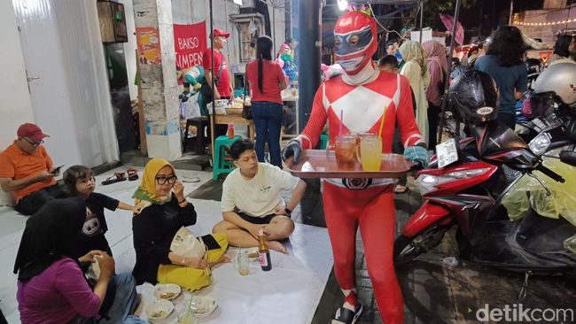 Purwokerto - Power Rangers kembali ke layar kaca dengan menjual Bakso Jimpeng di Purwokerto. Rangers merah, pink, hijau, kuning, dan biru siap melayani pembeli.