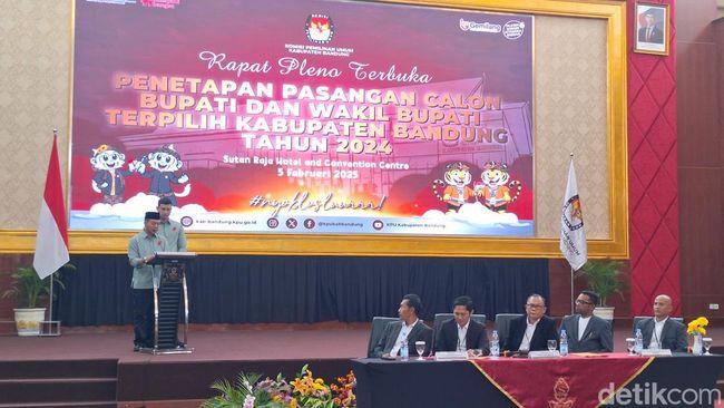 Rapat pleno penetapan paslon itu digelar di Hotel Sutan Raja, Soreang, Rabu (5/2/2025). Dalam penetapan tersebut paslon 1, Sahrul Gunawan-Gun Gun Gunawan terlihat tidak hadir.