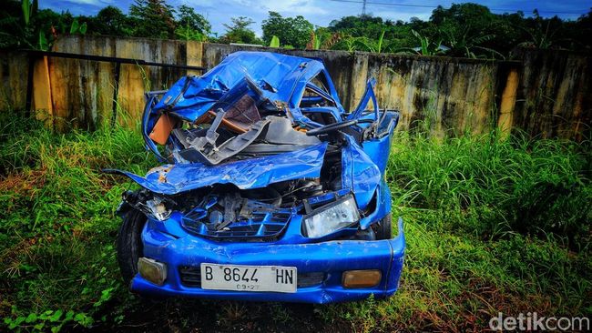 Dilihat detikJabar, kendaraan itu mengalami kerusakan parah di hampir seluruh bagian. Atap kendaraan ambruk total, terlipat ke dalam akibat benturan keras. Kap depan penyok dan tertekuk, dengan bagian mesin yang hancur.