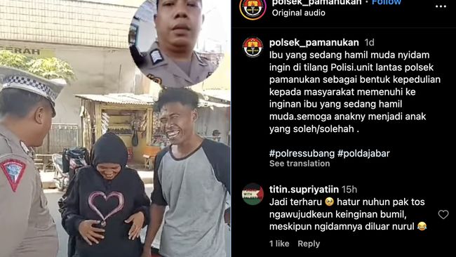"Ibu yang sedang hamil muda ngidam ingin ditilang Polisi. Unit Lantas Polsek Pamanukan sebagai bentuk kepedulian kepada masyarakat memenuhi keinginan ibu yang sedang hamil muda. Semoga anaknya menjadi anak yang soleh/solehah," tulis akun Instagram Polsek Pamanukan.