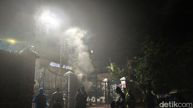 Sebelum membubarkan diri, aksi demo sempat memanas setelah massa melemparkan botol, batu hingga petasan ke arah polisi yang berjaga di dalam gedung.