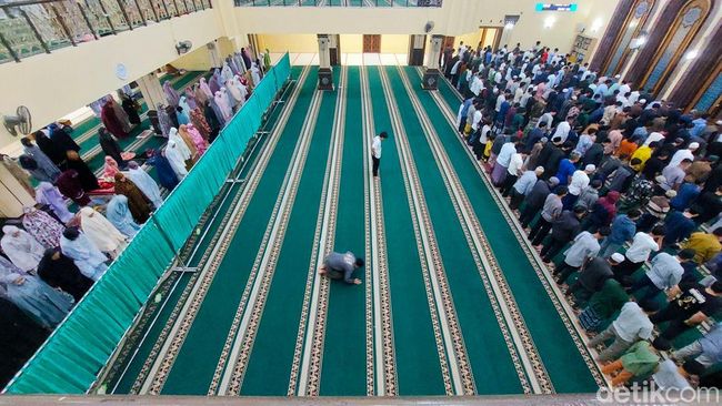 Saf salat terdepan diisi oleh jemaah laki-laki, sementara jemaah perempuan ditempatkan di bagian belakang dengan batas menggunakan tirai berwarna hijau.