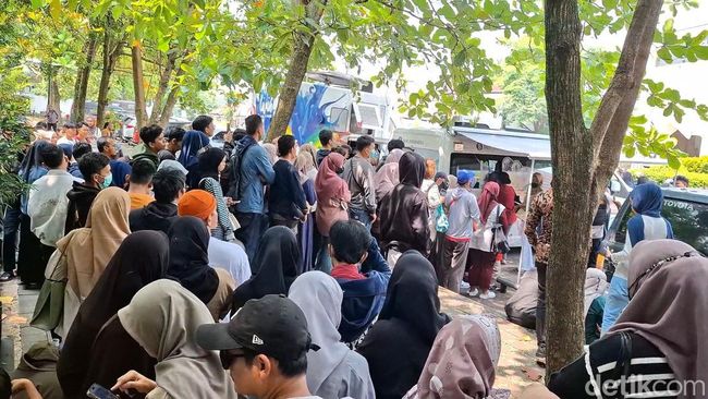 Pantauan detikJabar, antrean warga mengular sekitar 100 meter dengan terjadi penumpukan berlapis di sekitar mobil penukaran. Mereka rela antre berjam-jam meski berdiri. Terik matahari pun tidak menyurutkan mereka untuk terus antre demi mendapat uang baru.