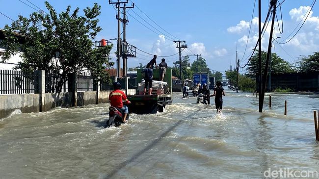 Pantauan detikJabar, Sabtu (8/3/2025), banjir yang menggenang cukup dalam. Sejumlah pengendara nampak tetap memaksa menerobos genangan banjir hingga berakhir mogok.