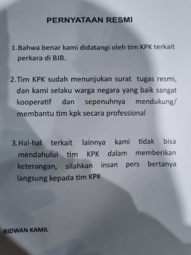 "Bahwa benar kami didatangi oleh tim KPK terkait perkara di BJB," ucap Ridwan Kamil saat memberi pernyataan tertulis kepada awak media melalui secarik kertas terkait penggeledahan yang dilakukan KPK.