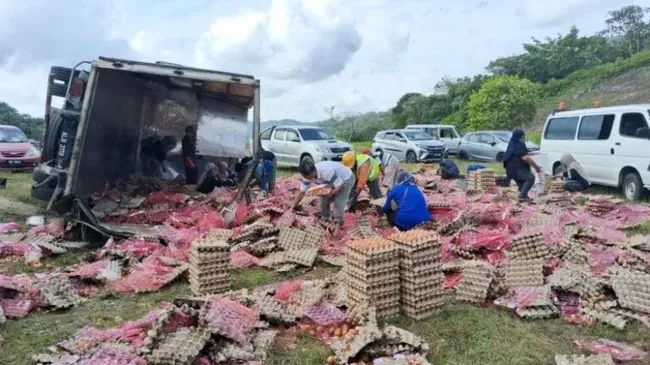 "Saya kira awalnya ada kecelakaan serius terjadi, tapi saya lihat banyak orang mengambil telur akhirnya saya ikut juga. Saya merasa cukup beruntung bisa membawa sebagian telur untuk keluarga saya di rumah," ungkap Azimah, salah satu pengendara.