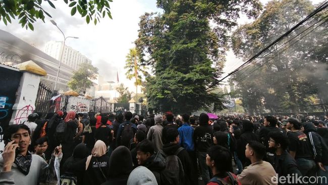 Terlihat di lokasi kobaran api muncul dari ban bekas yang dibakar di tengah-tengah kerumunan massa serta di dalam area Gedung DPRD Jabar.