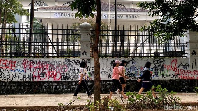 Pantauan detikJabar, Sabtu (22/3/2025) pagi sekitar Pukul 06.58 WIB, tembok depan gedung wakil rakyat dipenuhi coretan-coretan cat pilox yang berisikan tulisan-tulisan kritikan, salah satunya ditujukan ke Presiden Prabowo Subianto.
