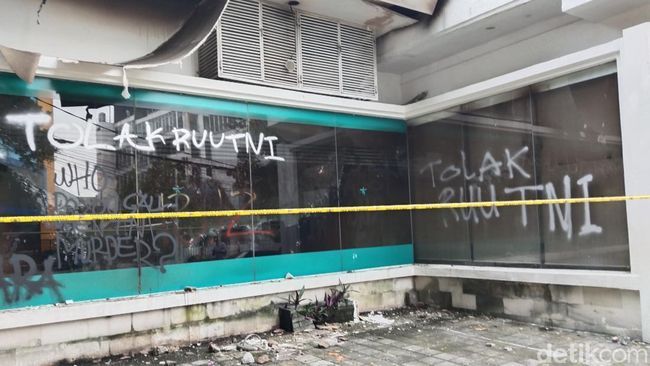 Selain penuh dengan tulisan kritik atas pengesahan revisi Undang-undang TNI, kaca di kantor Hana Bank sudah berserakan. Saat ini, kantor bank swasta itu pun sudah dipasang garis polisi untuk kepentingan penyelidikan.