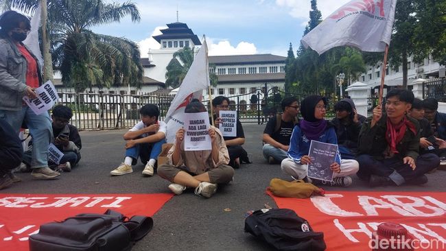 Berdasarkan pantauan detikJabar, pada pukul 15.30 tampak ada 20-an orang mahasiswa berkumpul di depan Gedung Sate Bandung, Minggu (23/3/2025). Mereka mengangkat spanduk yang salah satunya bertuliskan "Cabut RUU TNI, Hentikan Militerisasi".