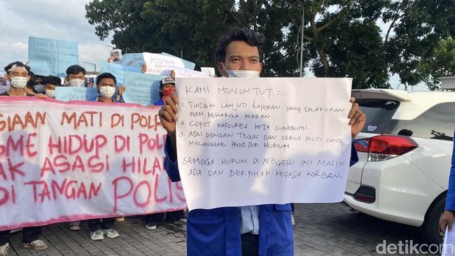 Pantauan detikJabar di lokasi, aksi demonstrasi ini dimulai sekitar pukul 17.00 WIB. Para massa membawa atribut demo bertuliskan 'Kemanusiaan Mati di Polres Sukabumi Kota, Anarkisme Hidup di Polres Sukabumi Kota, Hak Asasi Hilang di Tangan Polisi'.