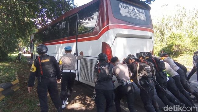 Melihat kondisi tersebut, sejumlah polisi langsung turun tangan untuk mengevakuasi bus agar tidak menghambat lalu lintas. Belasan personel, yang dipimpin langsung Kapolres Tasikmalaya Kota AKBP Moch Faruk Rozi, berusaha mendorong bus secara manual. Namun upaya tersebut tak membuahkan hasil. Proses evakuasi akhirnya melibatkan truk penarik.