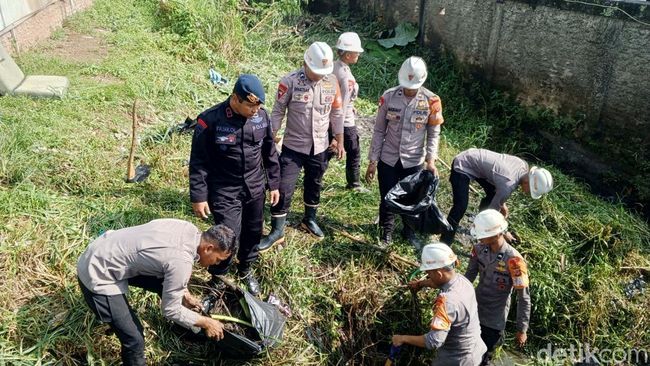 Personel Satuan Brimob Polda Jabar turun membersihkan sampah yang mengganggu aliran air di Sungai Cikeruh, Desa Sayang, Kecamatan Jatinangor, Kabupaten Sumedang, pada Jumat (11/4/2025). Pembersihan ini dilakukan untuk mencegah terjadinya bencana alam banjir di wilayah tersebut.
