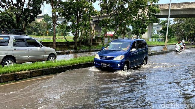 Genangan yang ada di jalan itu sekitar betis orang dewasa. Semua jenis kendaraan, motor dan mobil bisa melintas di genangan banjir itu. Kondisi tersebut dikeluhkan oleh para pengendara, salah satunya Imam (29).