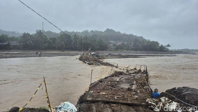 Jembatan alternatif di Desa Cidadap, Kecamatan Simpenan, Kabupaten Sukabumi, yang sebelumnya menjadi jalur pengganti usai ambruknya Jembatan Cidadap pada Maret 2025 lalu, kini roboh akibat dihantam luapan Sungai Cidadap, Senin (14/4/2025) dini hari.