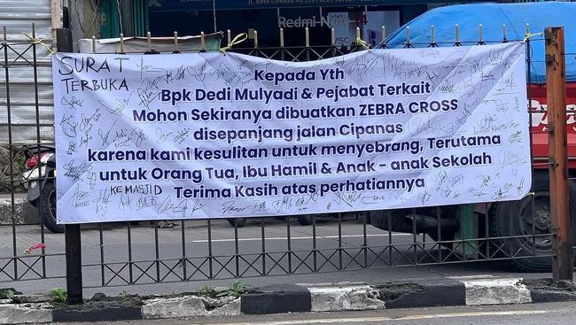 Warga Cipanas, Cianjur pasang spanduk berisi petisi untuk dibuatkan zebra cross di sepanjang jalur puncak. Petisi ini ditujukan untuk pemerintah provinsi maupun daerah.