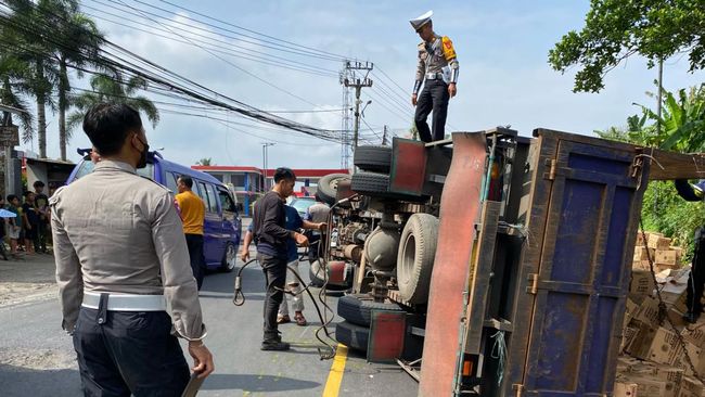 "Baik, kendaraan melaju dari arah barat ke timur. Setibanya di TKP, di depan SPBU Ongkrak ini, pengemudi mengalami ngantuk kemudian kendaraan mengalami oleng ke sebelah kanan sehingga terguling," kata Arif kepada wartawan.