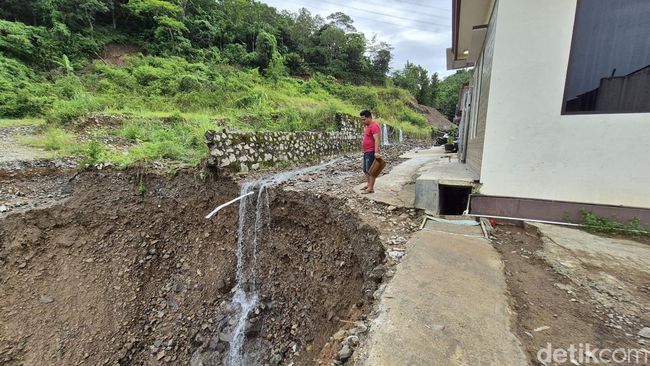 Hujan deras yang mengguyur wilayah Palabuhanratu, Kabupaten Sukabumi, Sabtu (19/4/2025) malam memicu longsor di Perumahan Frinanda, Desa Citepus. Sebagian badan jalan amblas, menyisakan lubang besar tepat di depan rumah warga. Air dari pipa pecah yang menggantung di bibir longsoran menciptakan aliran menyerupai air terjun.