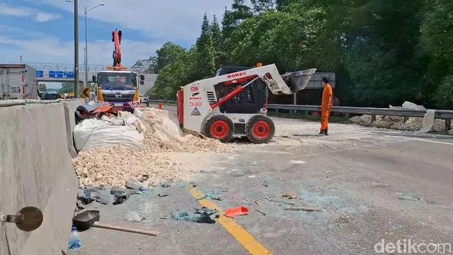 Sementara muatan truk berjenis batu kapur atau apung ini tumpah, batu yang dikemas dalam karung jumbo berserakan menutup jalan.