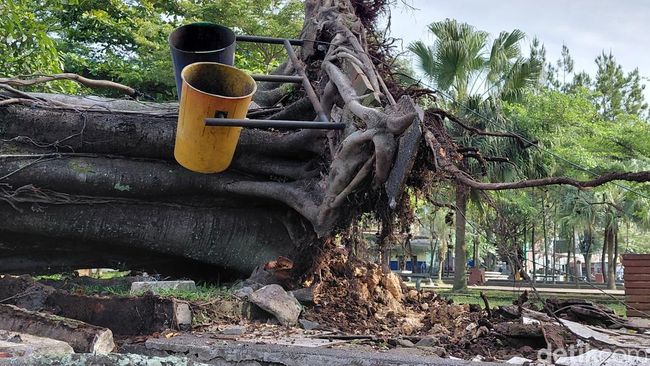 Pantauan di lokasi, bagian bawah pohon memiliki diameter besar dan tinggi mencapai 2 meter dari permukaan tanah. Tumbangnya pohon juga merusak pagar taman serta beberapa pot bunga besar di pinggir jalan.