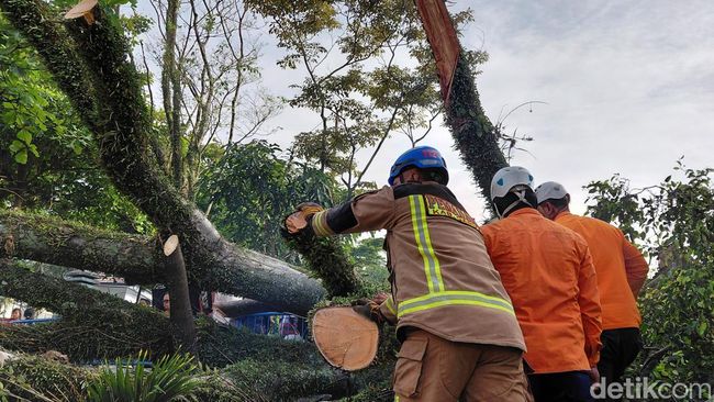 Insiden pohon raksasa tumbang ini terjadi sekitar jam 07.30 WIB di Jalan Raya Suherman, tepatnya di depan SD Negeri Gentra Masekdas.