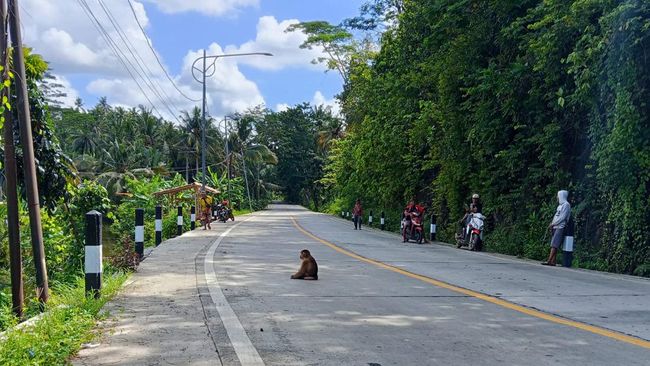 Seekor beruk liar menghebohkan warga dan pengguna jalan di jalur Cimerak-Legokjawa, Kabupaten Pangandaran, Jawa Barat, Senin (28/4/2025) siang. Sontak pengguna jalan menganggap hewan mirip monyet itu keluar dari hutan.