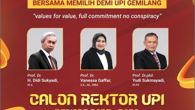 Tiga guru besar akan bersaing dalam pemilihan rektor Universitas Pendidikan Indonesia (UPI) periode 2025-2030. Mereka akan mengikuti serangkaian proses untuk nantinya terpilih satu untuk memimpin UPI ke depan.