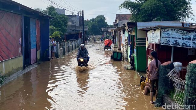 Pantauan detikJabar, Jumat (16/5/2025) sekitar Pukul 09.30 WIB luapan sungai menggenangi Jalan Panyadap-Bojong. Selain itu, warga menutup gang menuju pemukiman dengan menggunakan papan kayu, karena aliran sungai masih deras.