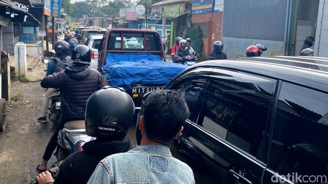 Antrean kendaraan dari arah Majalaya mencapai Jalan Cagak Sapan dan kendaraan yang mengarah ke Majalaya antreannya hampir mencapai Jembatan Sungai Cikeruh.