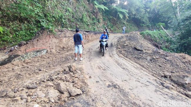 Pantauan detikJabar, Rabu (28/5/2025), kondisi jalan ambles cukup tinggi namun sebagian sudah diratakan agar pengendara sepeda motor bisa melintas. Ada sejumlah warga yang berjaga untuk mengatur sepeda motor yang melintas. Meski demikian, retakan jalan masih terlihat karena pergerakan tanah terus terjadi.