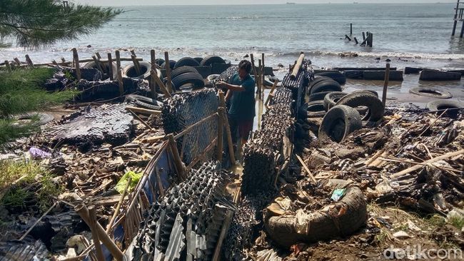 "Sampah ini kan awalnya buat pemecah ombak. Cuma hancur nggak kuat makanya di stop," kata warga di Blok Balongan 2, Baduni, Jumat (30/5/2025).