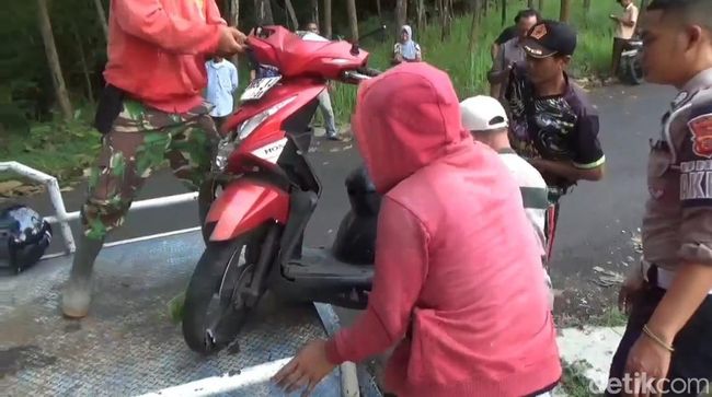 "Saya sedang berjaga di atas, lalu ada kabar dari warga bahwa ada pengendara motor jatuh. Saat saya datang ke lokasi, korban sudah dalam kondisi koma dan tidak sadarkan diri. Korban dua orang menggunakan sepeda motor, kayaknya ngeplos (rem blong)," ujar Asep.