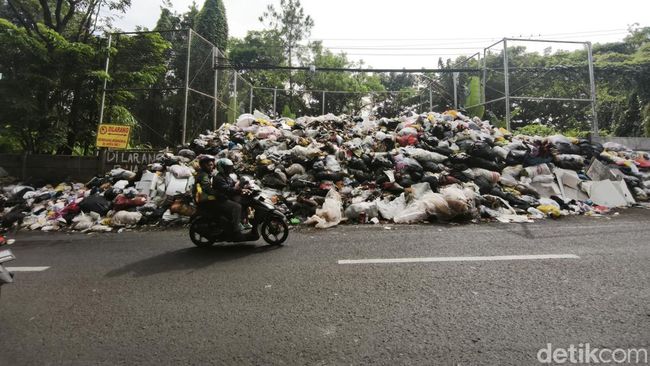 Pantauan detikJabar Senin (9/6/2025) pagi, sampah yang menumpuk hampir meluber ke bahu jalan dengan air lindi yang mulai muncul. Kondisi itu membuat bau menyengat menusuk hidung setiap pengendara yang melintas.