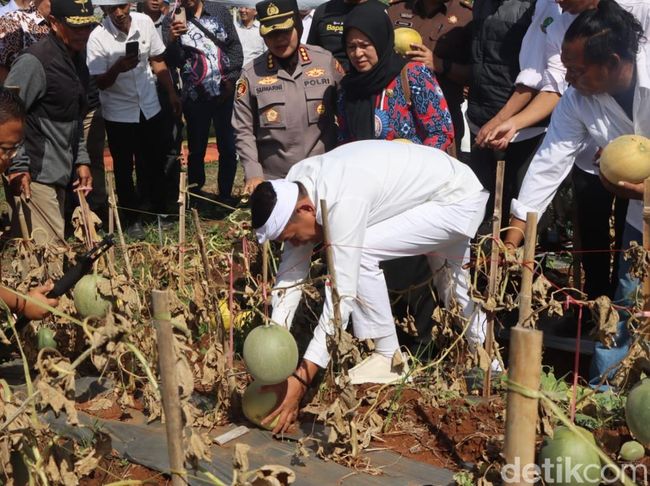 Gubernur Jawa Barat Dedi Mulyadi memetik langsung buah melon dalam kegiatan panen di lahan seluas 1,3 hektare di Desa Ciawijapura, Kecamatan Susukanlebak, Kabupaten Cirebon, Kamis (26/6/2025). Dedi langsung memborong dua ton melon hasil panen dari lahan yang dikelola Badan Usaha Milik Desa (BumDes) Ciawijapura.
